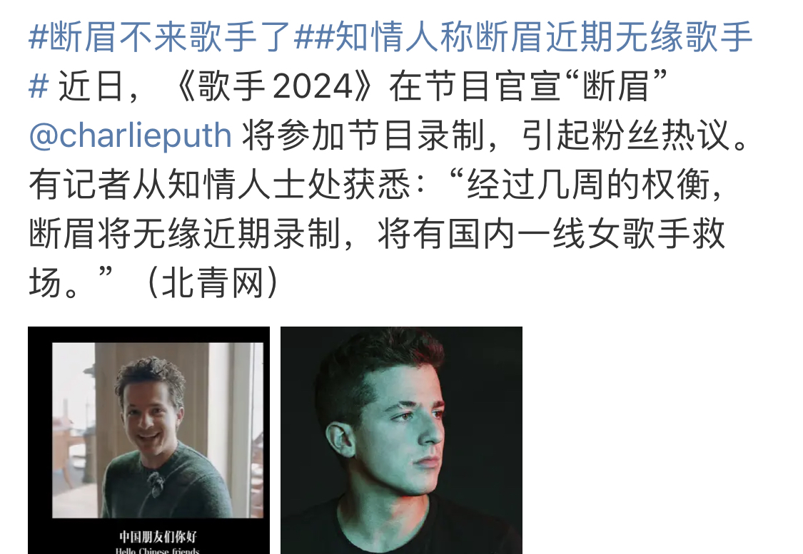 《歌手2024》之前直播中有官宣到鄙人一期袭榜赛的袭榜歌手是断眉,况兼还录制了vcr播放,然而周边节目播出,网罗上曝光出断眉不来歌手,搭档的音乐联合东说念主万妮达的行程里也莫得歌手的录制。